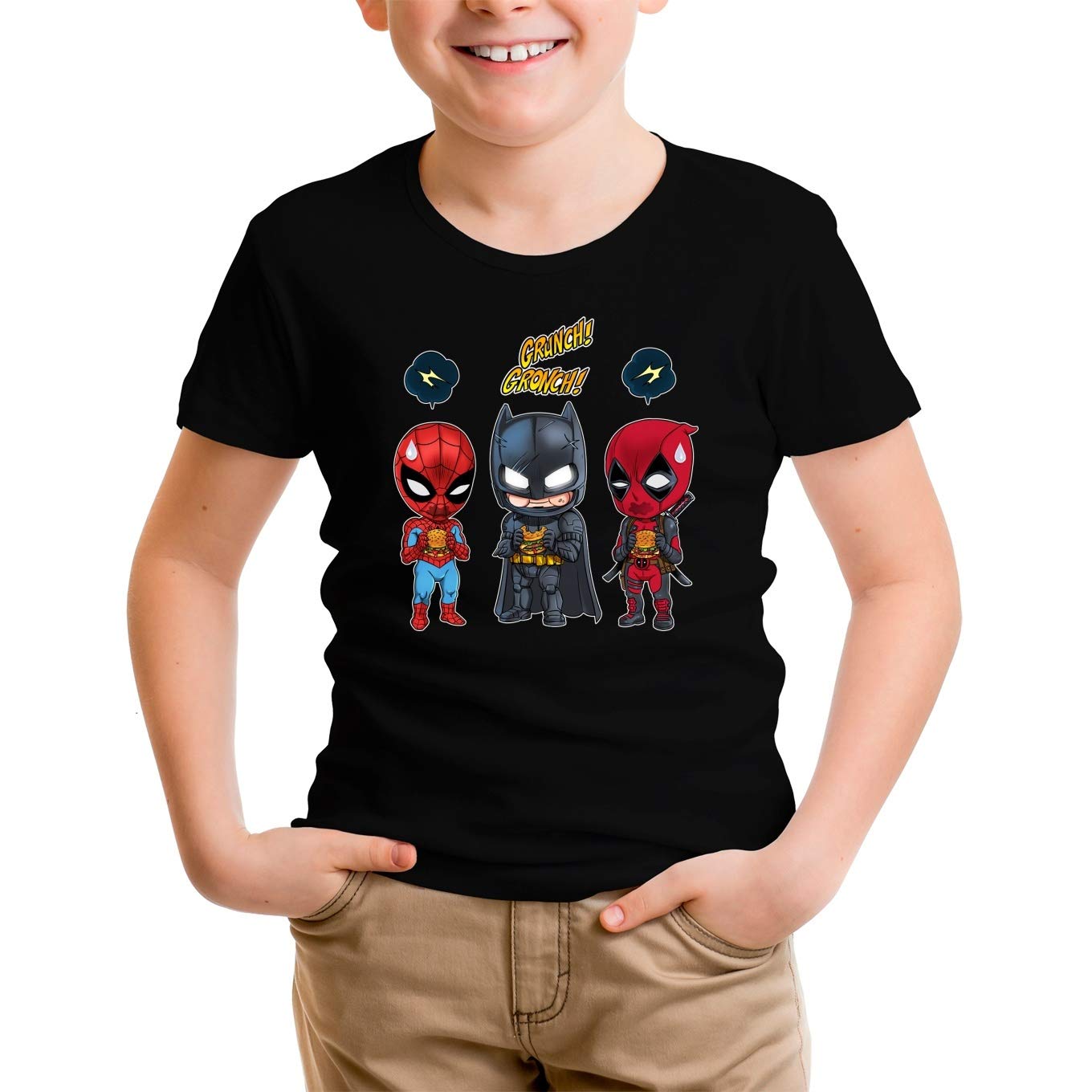 Avengers Lustiges Schwarz Mädchen Kinder T-Shirt – Batman, Deadpool und Spider-Man (Avengers Parodie) (Ref:1062)