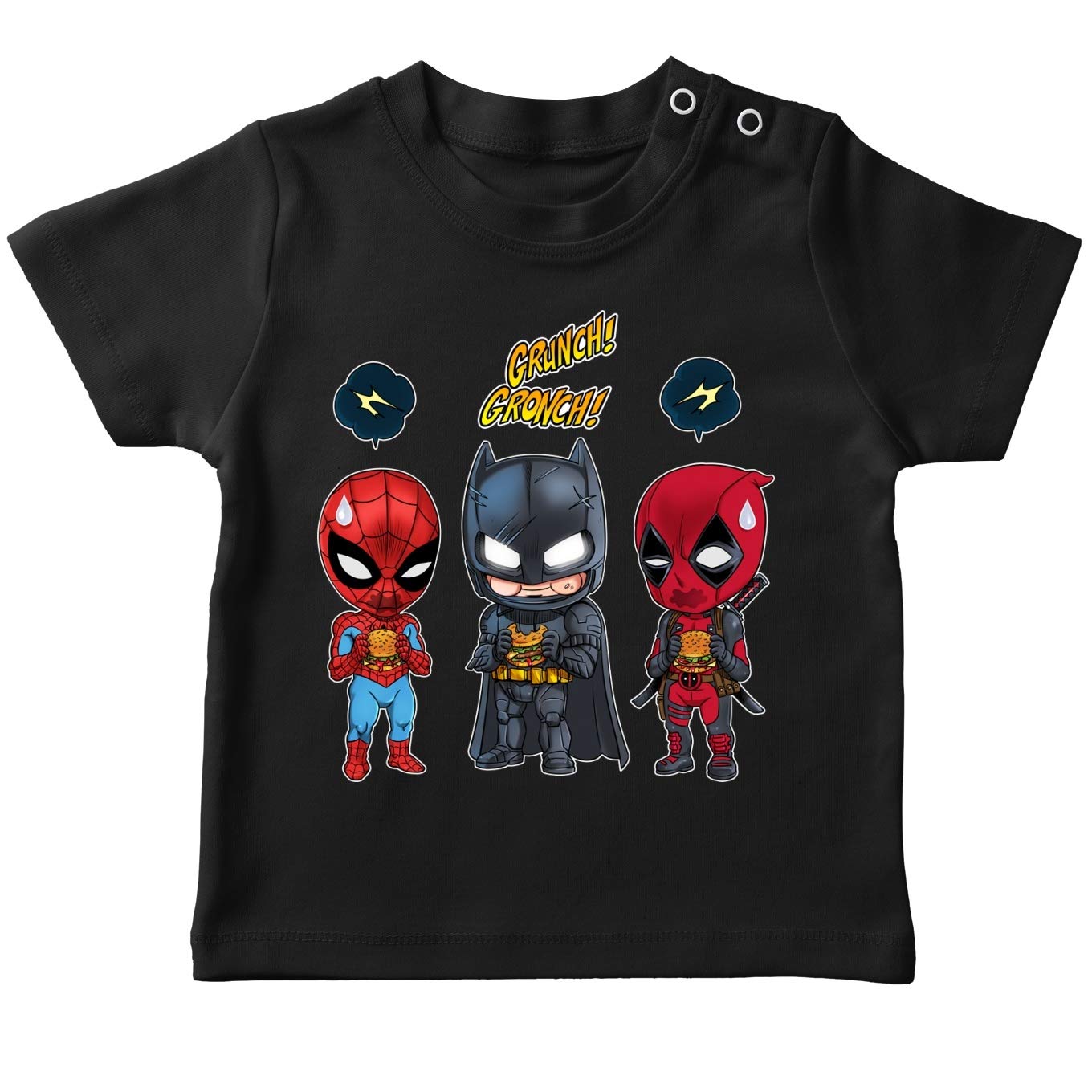 Erstklassiges Baby T-shirtvon Okiwoki (französischer Marke). Parodistisches Design, fun und sehr stilvolles mit Batman, Deadpool und Spider-Man von Avengers